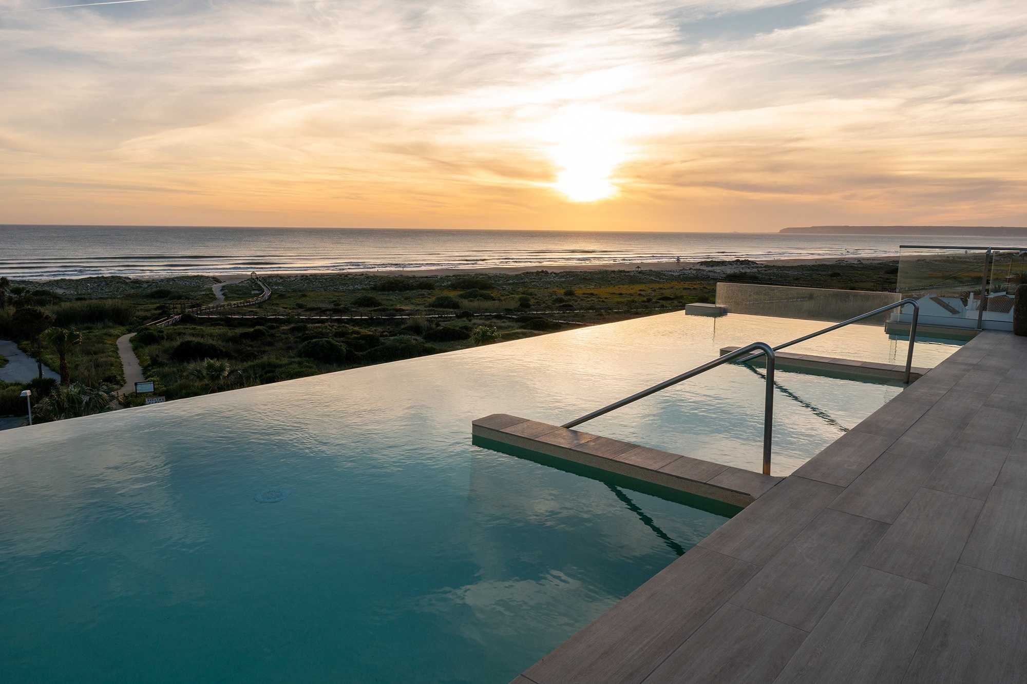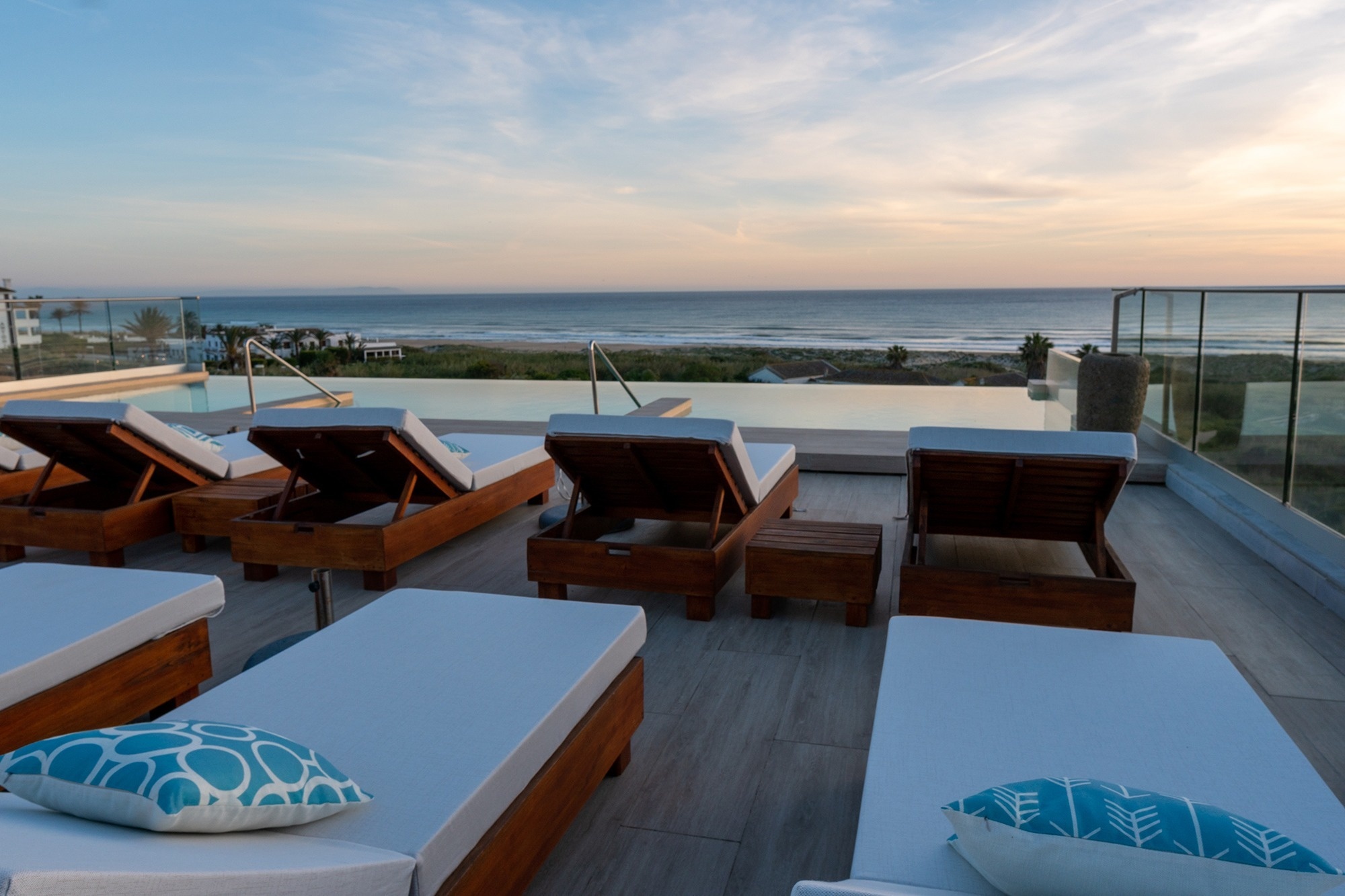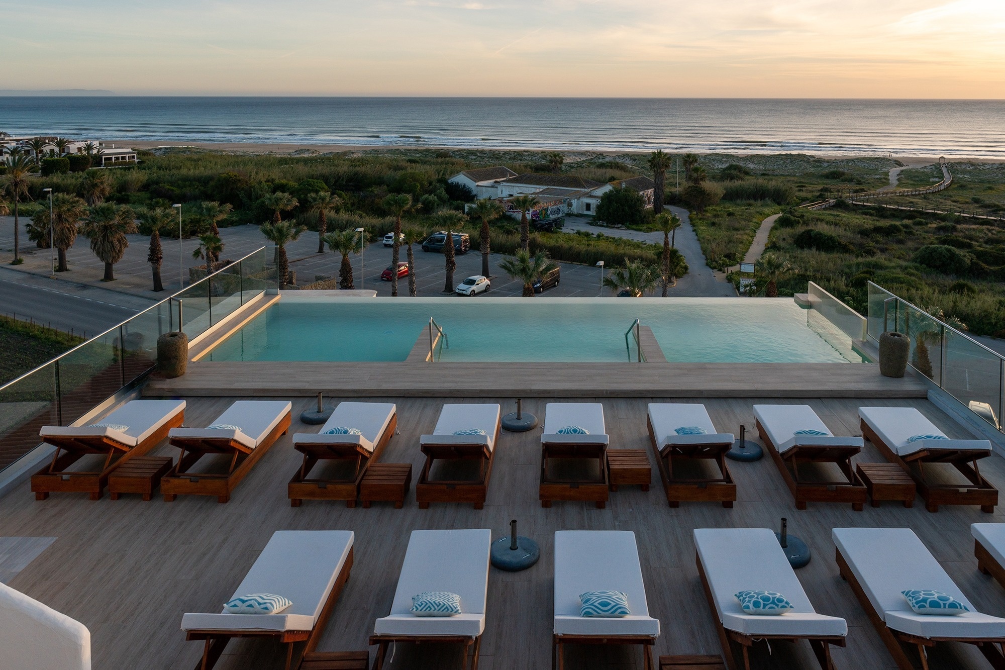 Entdecken Sie die grenzenlose Eleganz des Infinity-Pools des Zahara Beach Hotels, einem Rückzugsort für Erwachsene, wo der Atlantik auf den Himmel trifft. Schweben Sie in unserer endlosen Wasserfläche, während Sie den goldenen Sand von Zahara de los Atunes bewundern, lassen Sie sich von den Sonnenuntergängen in Cádiz verzaubern, die den Horizont in Rot- und Orangetöne tauchen, und genießen Sie jeden Moment frisch von unseren Barkeepern servierte Cocktails – all das auf einer Panoramaterrasse, die Luxus, Komfort und die pure Essenz des andalusischen Sommers vereint.